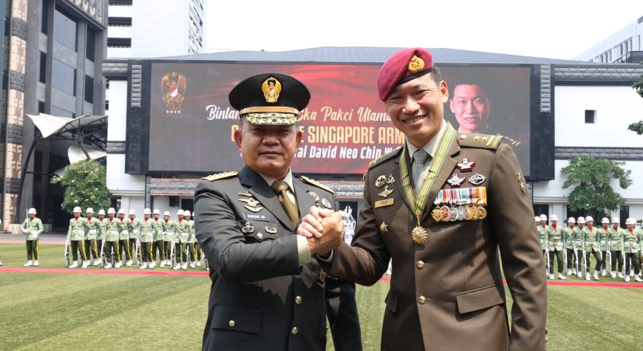 Jakarta – Kabarlagi.id.Sebagai bentuk penghargaan atas terjalinnya kerja sama militer selama 35 tahun antara TNI Angkatan Darat dan Angkatan Darat Singapura, Kepala Staf Angkatan Darat (Kasad) Jenderal TNI Dr. Dudung Abdurachman, atas nama Negara Republik Indonesia, menganugerahkan Bintang Kartika Eka Paksi Utama kepada Chief of The Singapore Army (Kasad Singapura), Major General David Neo Chin Wee, di Markas Besar Angkatan Darat (Mabesad), Jakarta, Senin (18/9/2023).