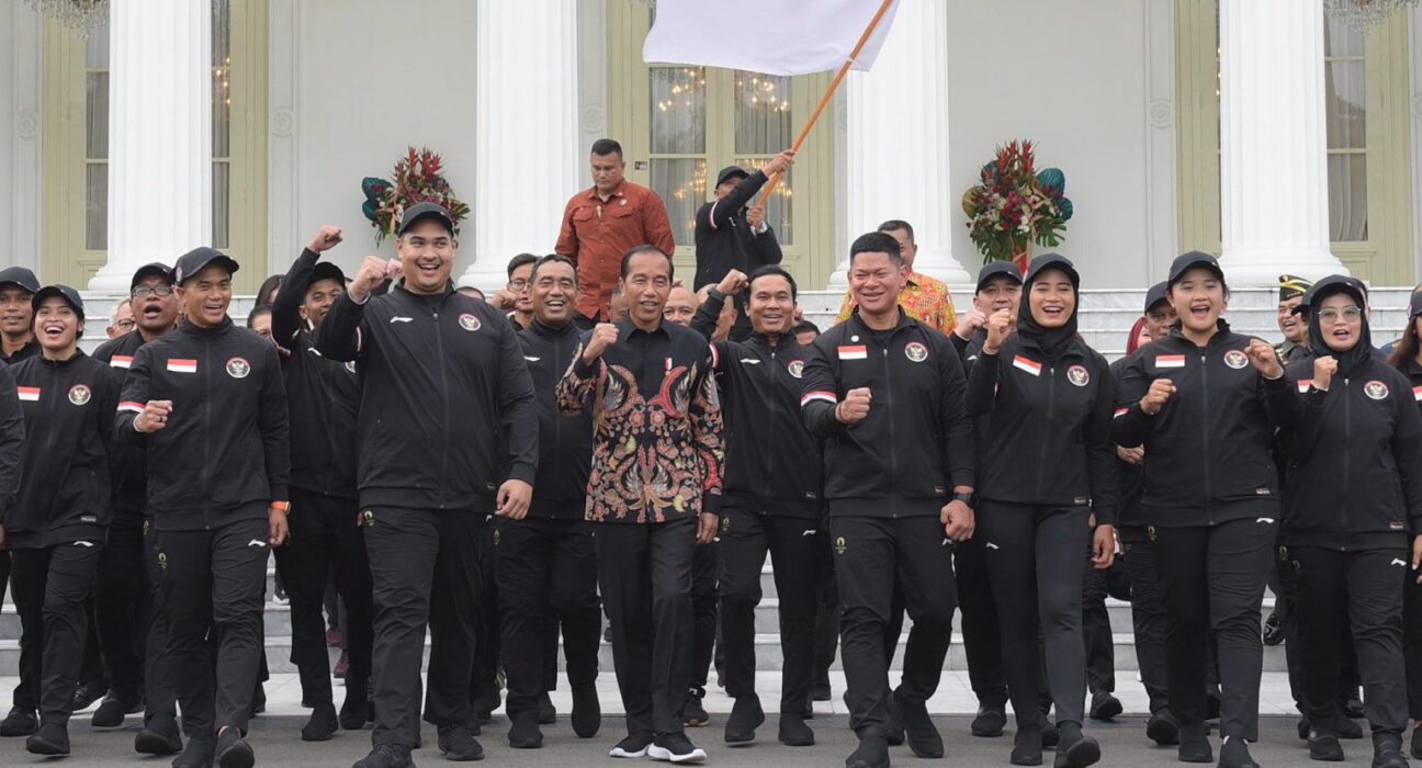 Presiden RI Joko Widodo (Jokowi) melepas Tim Indonesia Menuju Olympic Games XXXIII Paris 2024, Rabu (10/07/2024) sore, di Halaman Depan Istana Merdeka, Jakarta. Pada kesempatan tersebut, Presiden mengajak para atlet untuk optimistis dan bertanding dengan penuh semangat.