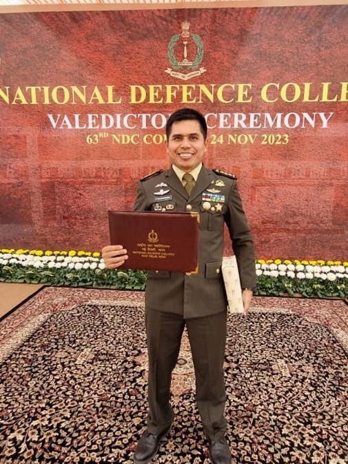 Jakarta – Kabarlagi.id.Prestasi membanggakan ditorehkan salah satu Perwira TNI AD yang berhasil mengharumkan nama Indonesia saat mengikuti Pendidikan di National Defence College India. Kolonel Inf Polsan Situmorang berhasil meraih Book Prize Award dengan karya tulis Research Thesis terbaik yang diserahkan langsung oleh Komandan NDC Lieutenant General Sukrity S Dahya, pada penutupan pendidikan National Defence College, di New Delhi, India, Jumat (24/11/2023).